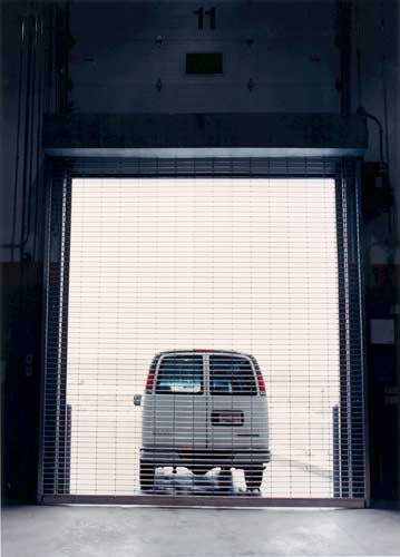 The grille curtain is constructed with 1-1/2-inch spacing between aluminum links, offering a balance between visibility and robust security.