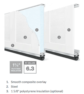 Optional 1-5/8″ vinyl-backed polystyrene insulation improves energy efficiency. Insulated doors have a 6.3 R-value. (Calculated door section R-value is in accordance with DASMA TDS-163.)
